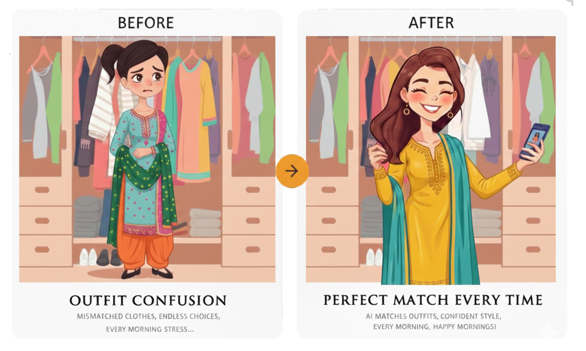 See how the same outfit could look as a long shirt, short kurti, straight cut, or A-line — with colors matched to your skin tone.